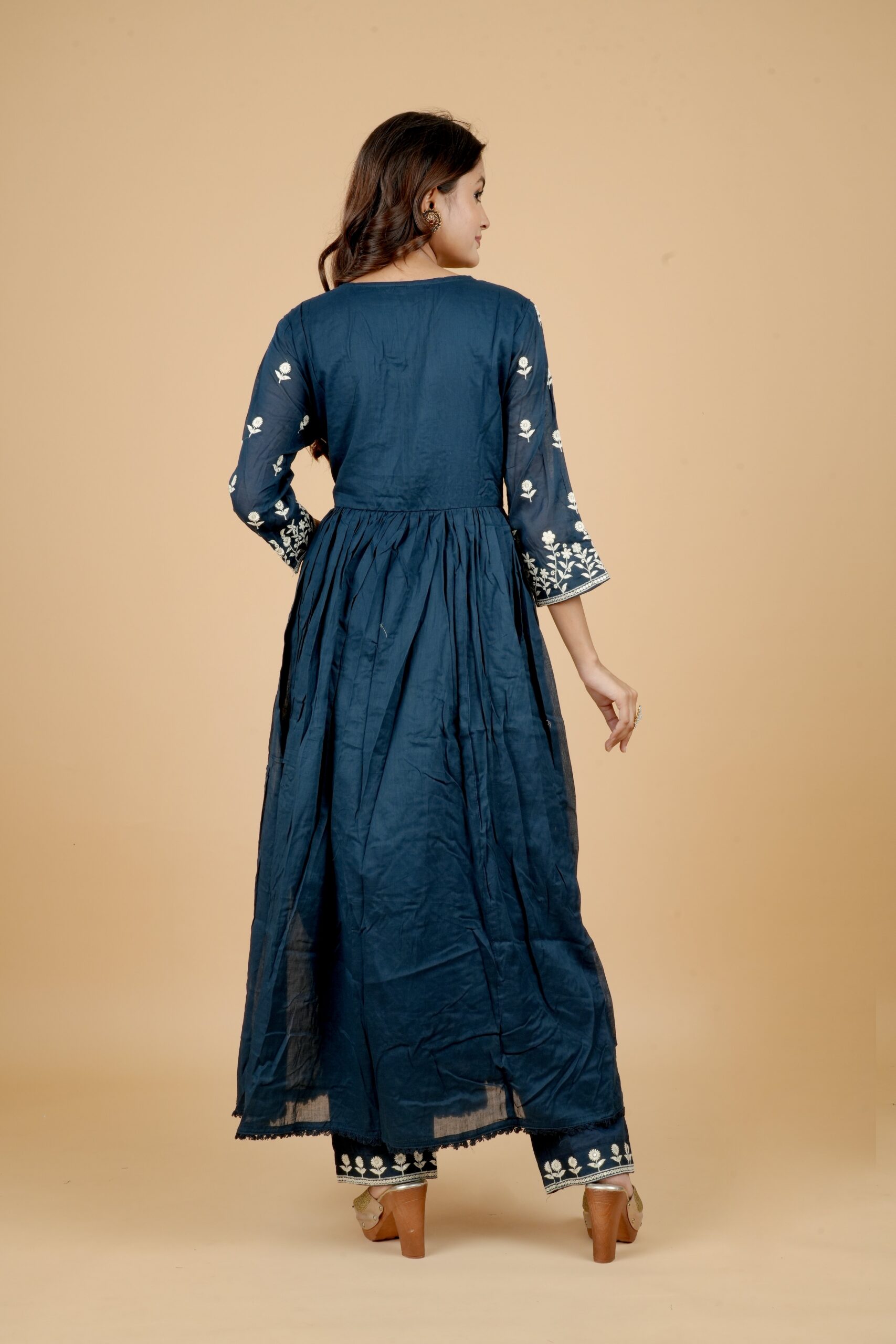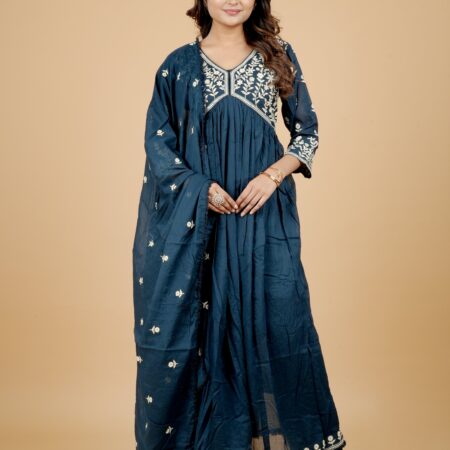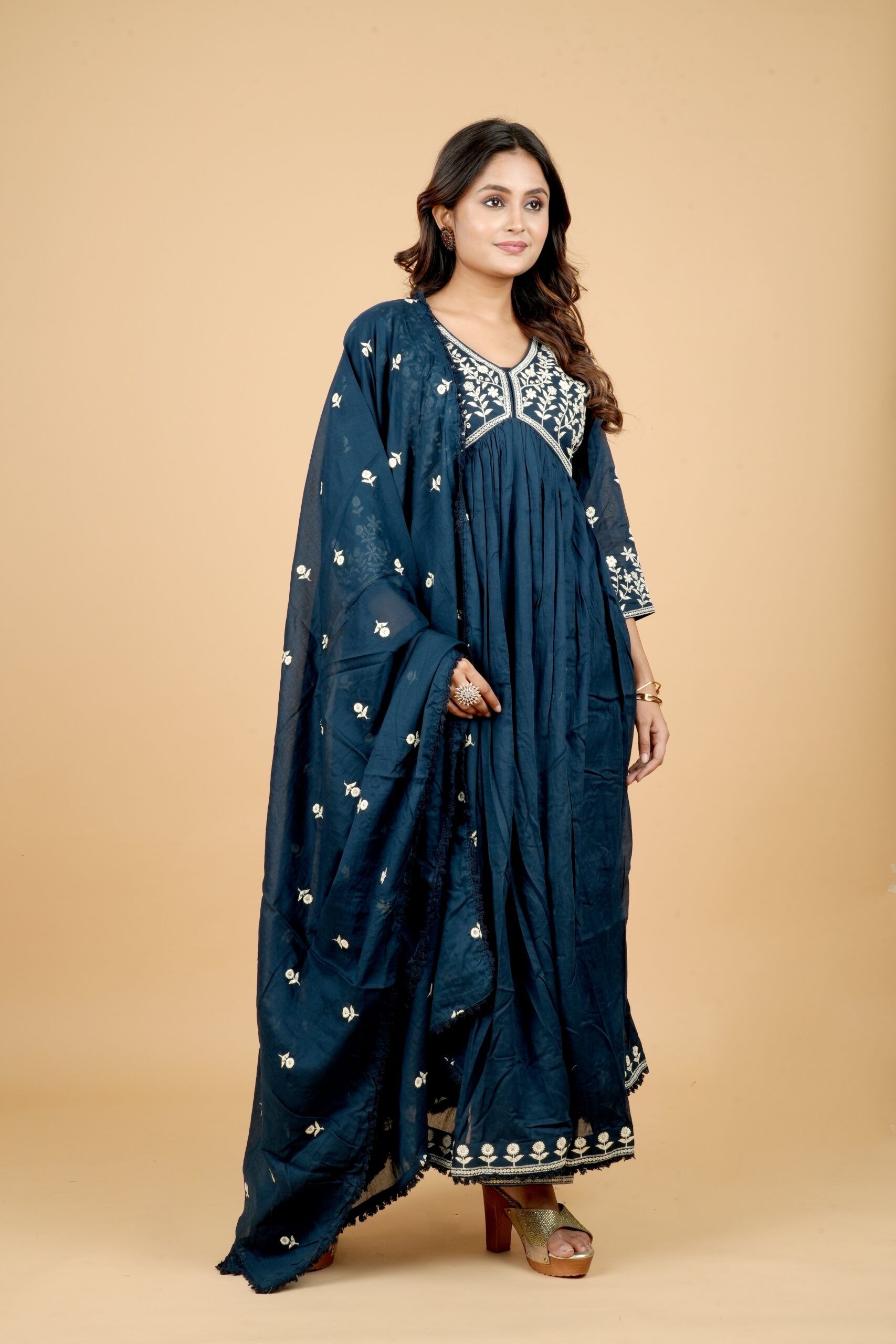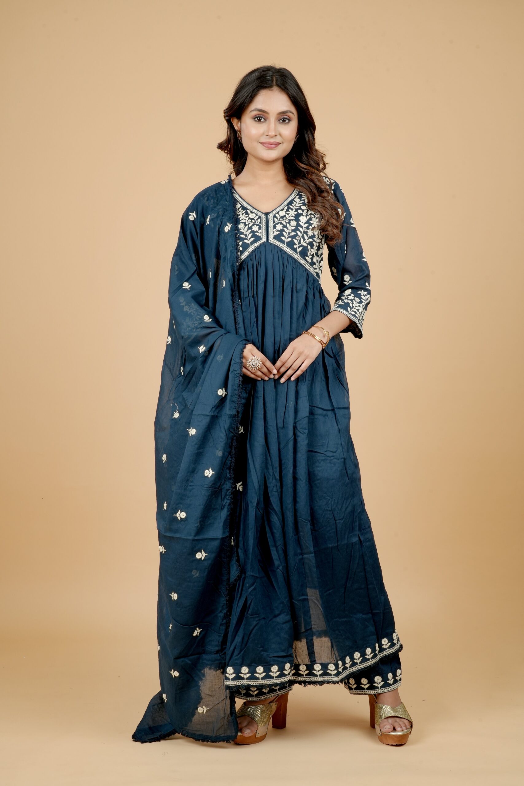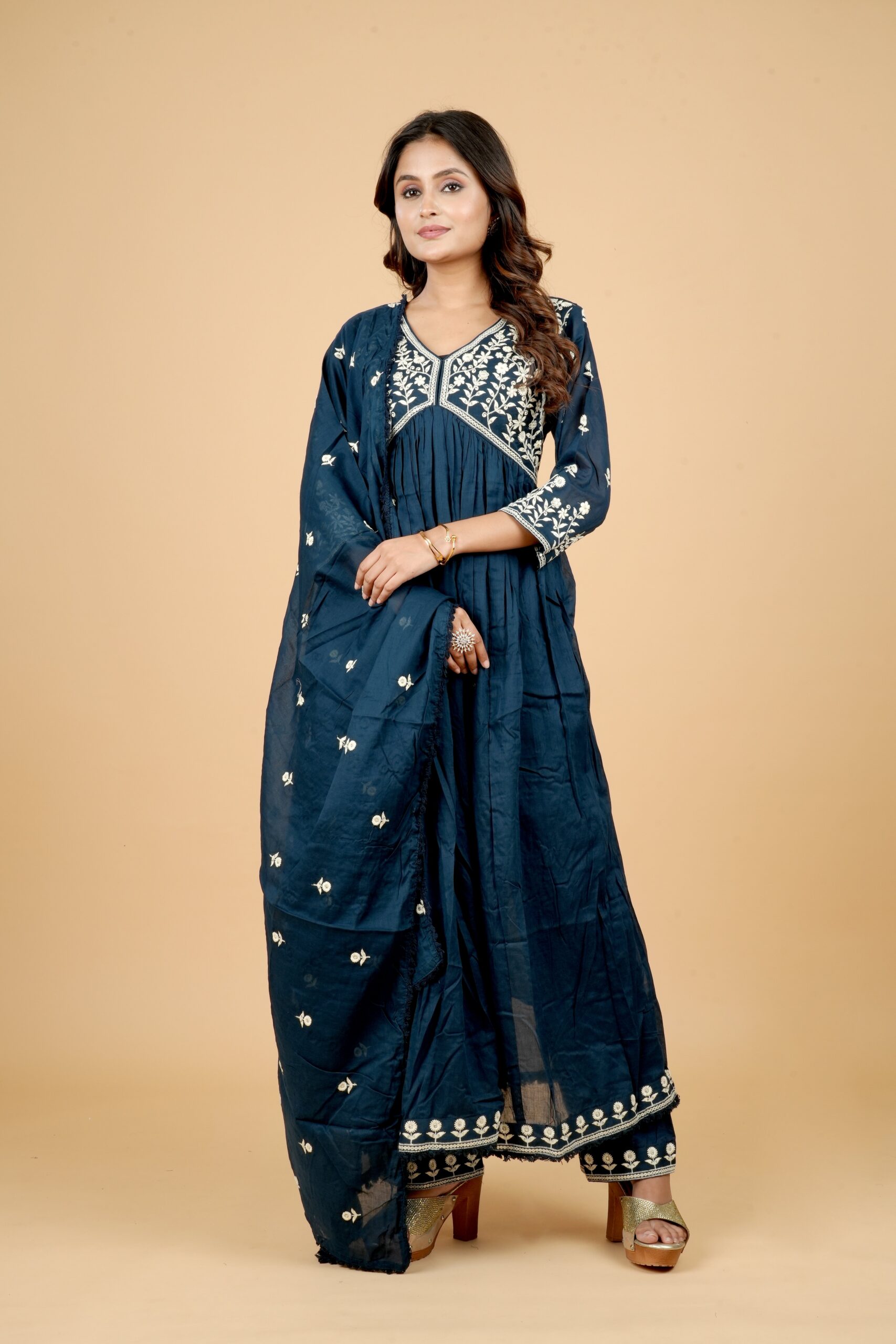 Know MoreThis navy blue kurta set showcases delicate white embroidery, adding a touch of elegance to the classic silhouette. It includes a matching dupatta with embroidered details, perfect for a coordinated look. Ideal for festive occasions, family gatherings, or a stylish casual outing.
